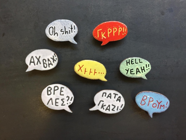 Enamel on copper pin. You can order a custom one with the words you want (as long as it doesn't say too much!)