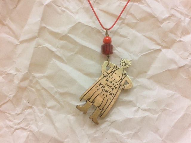 Silver or brass. Inspired by all the preparation weeks before Christmas and new years eve. All the lights and the decorations and the promotions it is such a show-of. So let us laugh with it all. They flash us, we flash them! (The writing says "Happy new year" in Greek) The year is stamped on his back.