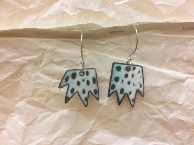 Each pair comes out a little different. Enamel on copper, with silver hook.