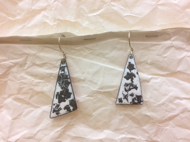 Every pair comes out a little different. Enamel on copper with silver hooks.