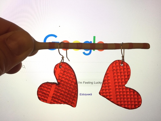 Hearts made from car's red light that I found on the street. Every pair is slightly different, depending on what light I find each time. With silver hooks.