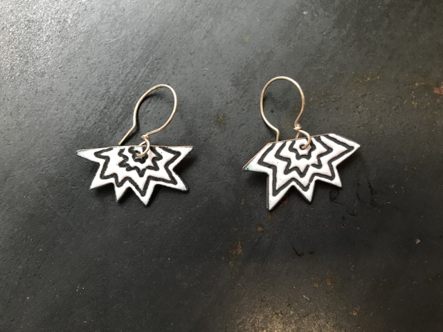 Enamel on copper with silver hooks. The earrings are made by hand one by one so there will be slight variations from what you see in the picture.
